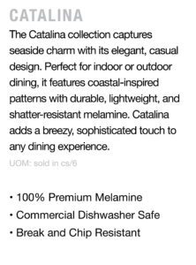 The Catalina Coastal Melamine Dinnerware collection brings the relaxed charm of the seaside to your table with its elegant yet casual design. Ideal for both indoor and outdoor dining, this collection combines the beauty of coastal-inspired patterns with the durability and practicality of melamine. Each piece in the Catalina collection is lightweight, shatter-resistant, and easy to clean, making it perfect for busy dining settings or gatherings. The Catalina Coastal Melamine Dinnerware not only offers a stylish and inviting look but also ensures long-lasting performance, providing a sophisticated solution for any dining experience that evokes the breezy, tranquil feel of the shore.